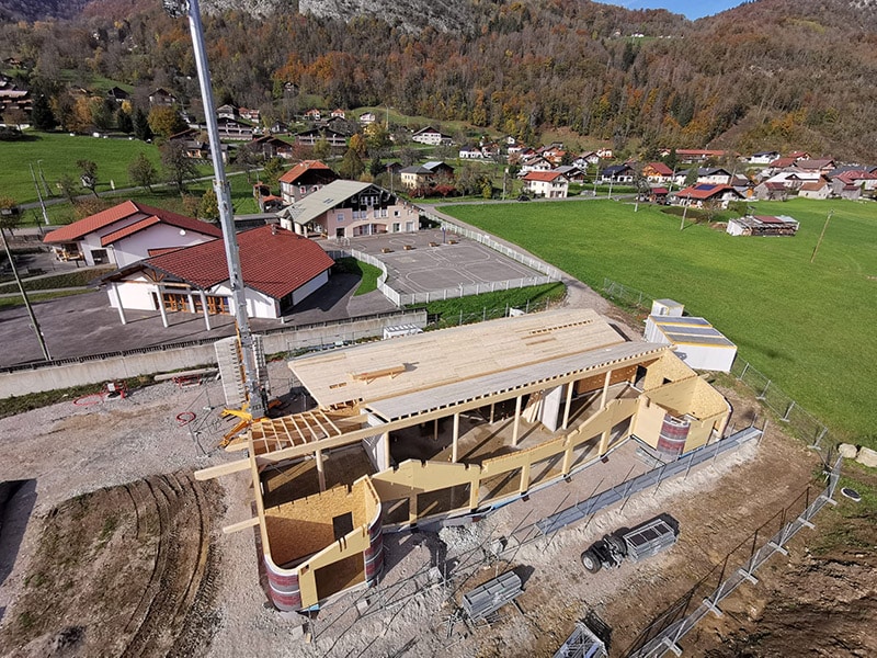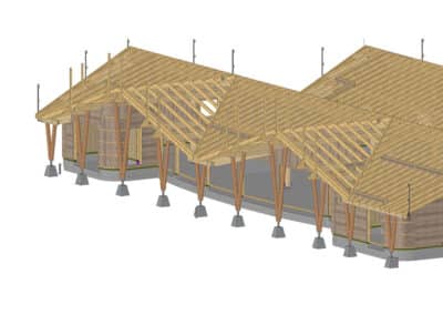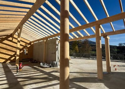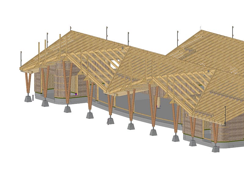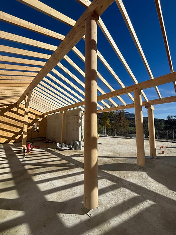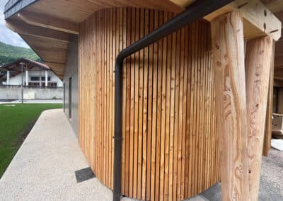 Architecture contemporaine caractérisée par des poteaux cylindriques et des murs à ossature bois aux formes arrondies.