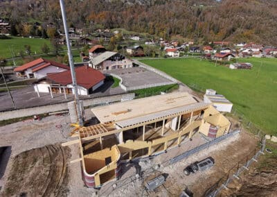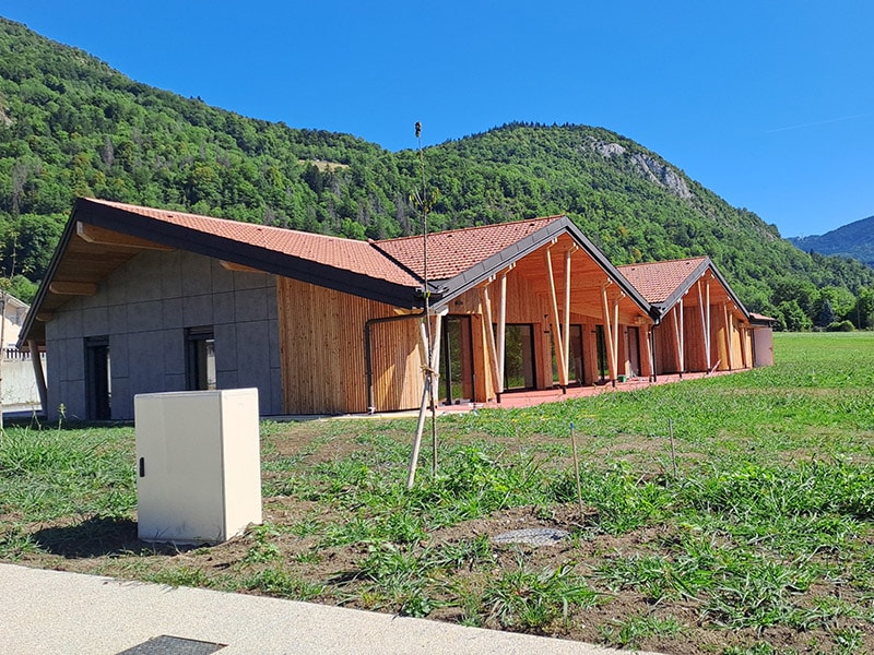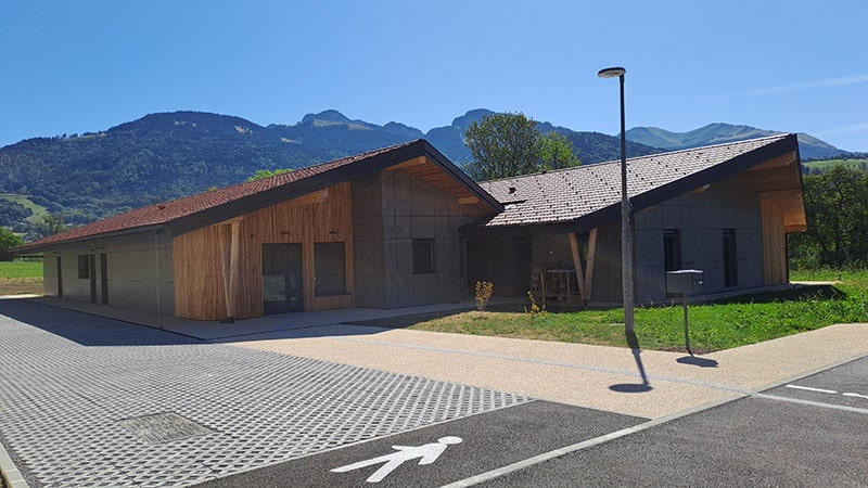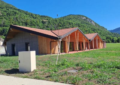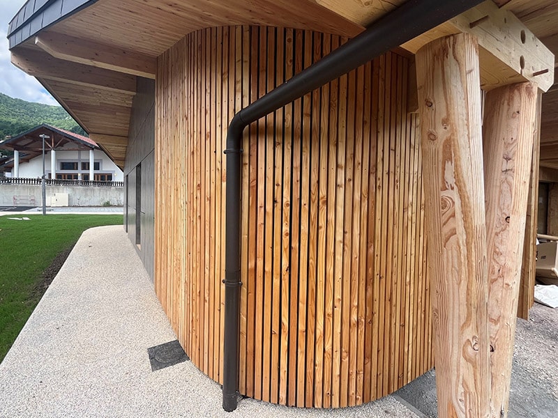 Bardage vertical en Mélèze BOIS DES ALPES ainsi que du bardage en panneau composite